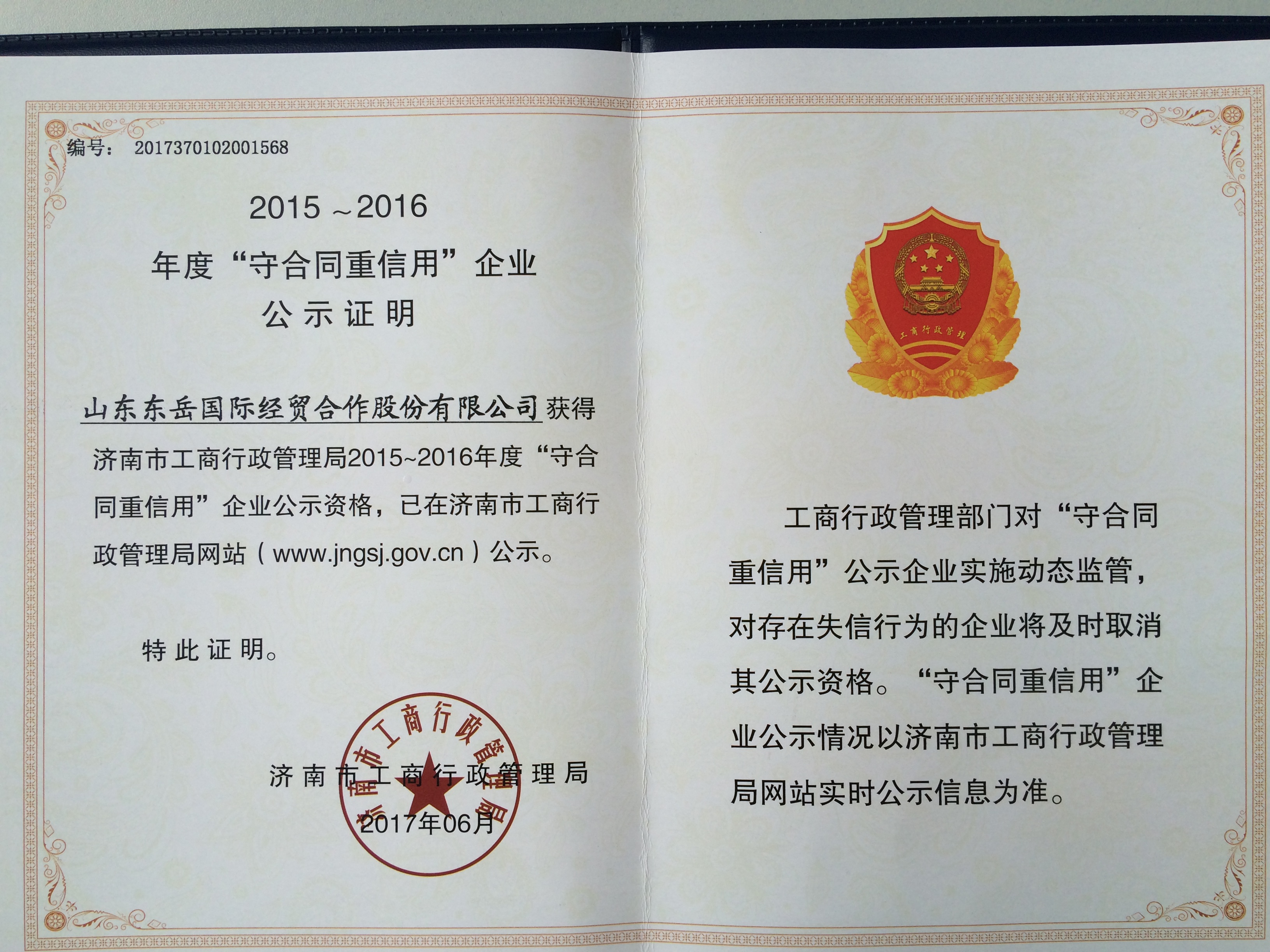 為進(jìn)一步推進(jìn)“誠信濟南”建設,我公司根據《工商局關(guān)于“守合同重信用”企業(yè)公示工作的若干意見(jiàn)》和《山東省守合同重信用公示辦法》的精神,緊抓合同審核與跟蹤管理,積極配合濟南市商事改革發(fā)展,經(jīng)濟南市工商行政管理局嚴格審查,我公司獲得濟南市工商行政管理局2015~2016年度“守合同重信用”企業(yè)公示資格,并已在濟南市工商行政管理局網(wǎng)站(www.jngsj.gov.cn)公示。