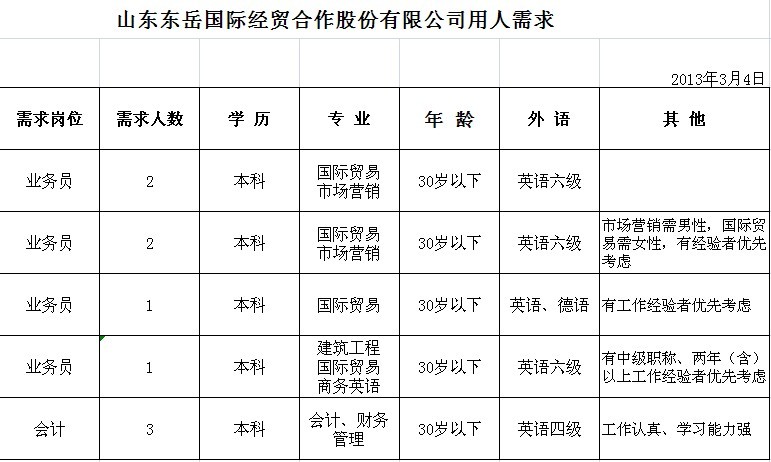山東東岳國際經(jīng)貿合作股份有限公司用人需求